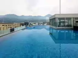 Three people will be staying. The lobby on the first floor is adorned with reinforced concrete and wooden puzzle patterns, creating a striking design. The building is 14 stories high, with an infinity pool on the rooftop floor (RF) and gender-separated large public baths and open-air baths on the 14th floor. This modern hot spring resort hotel is situated right in the heart of the city.
