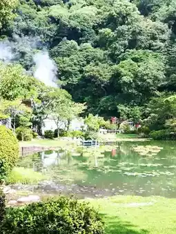 2. The view upon entering is beautiful, with a lotus pond, the turquoise Umijigoku Onsen, and a small blood pond.