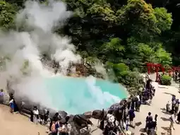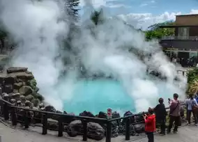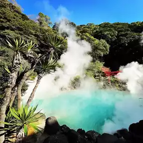 Jigoku Meguri amidst vibrant colors: Stroll through the eight "hell" hot springs, especially "Umi Jigoku" (Sea Hell) with its turquoise blue waters and "Chinoike Jigoku" (Blood Pond Hell) with its crimson red waters. These springs are set against a backdrop of mountains and trees turning red and yellow, perfectly contrasting with the rising hot steam.