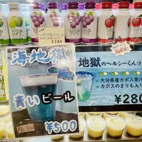 Umi Jigoku is a spot where you can enjoy the water lily pond, the giant lotus greenhouse, foot baths, a shop, a museum, and more. Recommended dishes are the blue beer and fried chicken ☆