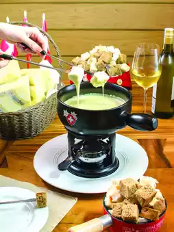 • Cheese Fondue 🫕 Hot cheese fondue paired with bread in a cozy restaurant.