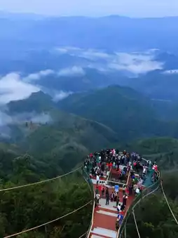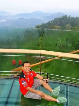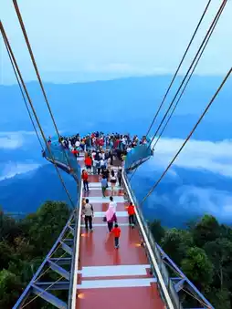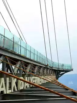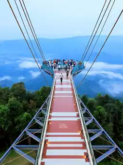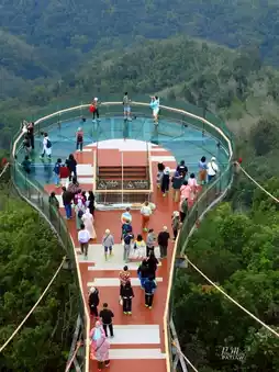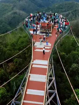 🌁 The Aiyerweng Skywalk is 621 meters above sea level. Its highlight is the 63-meter long walkway extending from the base. The glass-bottomed observation deck at the end offers a colorful and exciting view of the ground below. This viewpoint offers year-round views of the sea of mist and views of the Hala-Bala forest, one of the most pristine forests in Asia.