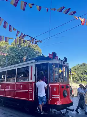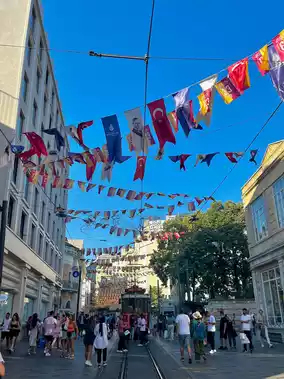 Beyoğlu Street in Istanbul is a bustling street known for its boutiques, galleries, theaters, and numerous restaurants. There are many things to see, such as the flags of all nations hanging on the street and European-style trams running across the street.