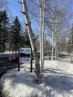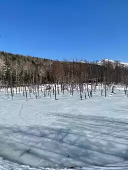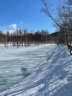 The snowy Blue Pond (Shirogane Aoi Pond) is a must-see attraction in the Furano and Biei areas of Hokkaido. The blue water of the lake is invisible, only white snow. The lake covered with snow is so beautiful.