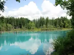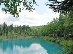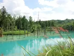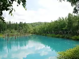 This pond isn't a natural occurrence. It was created by a dam on the Biei River in 1988 to prevent lava flows from Mount Tokachi into Biei. There are several ponds created by this dam, but only this one boasts its stunningly clear turquoise water. This happens because the source of the pond's water flows from the Biei River, which meets with Shirohige Falls, also known as Whitebeard Falls, in Shirogane Onsen, which is rich in aluminum. This creates a colloid that reflects different shades of blue depending on the weather, giving it the name Blue Pond. This is due to the presence of heavy metals in the pond. Therefore, swimming is not permitted as it can be dangerous.