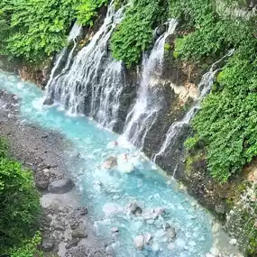 Shirahige Falls is located in #Shirogane Onsen Township, Biei Town. The waterfall has a drop of 30 meters and an altitude of 600 meters. The waterfall cascades down from the cracks in the rocks, and the water flows like a white beard, hence its name. Because the mineral-rich Io-Kurosawa River converges with the Shirahige Falls and the Biei River below it, the reflection and refraction of sunlight produces the Tiffany blue color of the stream. The entire attraction can be visited for approximately 30 minutes to 1 hour. Shirahige Falls is the source of the Blue Pond, another famous attraction. The deep pool of the waterfall is the same dreamy blue as the Blue Pond, and is loved by everyone.