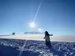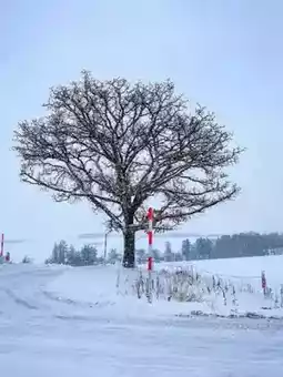 It was once used as a filming location for Nissan car commercials. There are snow-covered mountains in the distance. The contrast between the snow and the blue sky is particularly clear. It is a peaceful countryside. It is also nice to have a hot drink in the nearby cafe "Tree Terrace" and admire the trees.