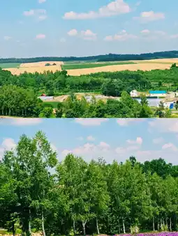 Looking at the endless green fields and white clouds touching the sky outside the window