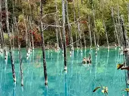 Next stop is Shirogane Blue Pond, a stunning blue-colored pond surrounded by autumn foliage. There’s a spacious parking lot where you pay at an automatic machine and present the ticket at the exit.