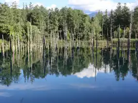 When visiting Biei in Hokkaido, aside from the romantic flower fields, the most breathtaking sight is the magical "Blue Pond (Shirogane Aoike)."