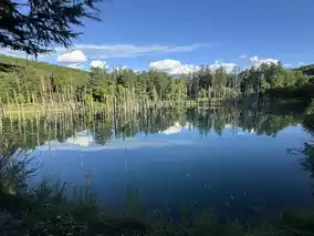 • Standing in the pond are birch trees and deadwood, whose reflections on the blue water create a surreal scene.