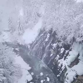 The water source of Shirahige Waterfall originates from the Tokachi Mountain Range. The mineral-rich spring water gives the waterfall its unique 'Blue Valley' hue, which remains unfrozen even in the harshest winters. The interplay of white snow, the waterfall, and the blue valley creates a breathtakingly beautiful sight.