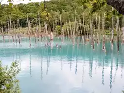 The standing withered trunks of Japanese larch and birch trees in the pond create a striking contrast with the translucent blue water, evoking an otherworldly scene. This unique blue hue results from the scattering of sunlight by microscopic particles (colloids) formed when minerals such as aluminum from upstream hot spring water mix with the water of the Biei River. As the seasons change, the pond displays varying shades of blue, making it a must-visit destination for photographers and travelers alike.