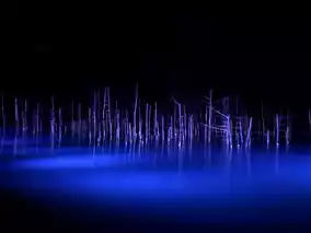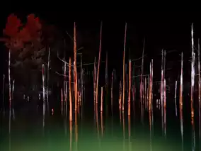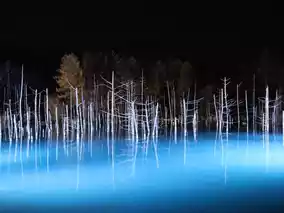 Shirokane Blue Pond, known as a tourist attraction in Biei, Hokkaido, is lit up at night for a certain period of time starting in autumn, creating a fantastic landscape that is different from the daytime. The color of the illumination changes depending on the time of day, and one story is expressed in about 10 minutes.