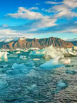 The sunlight shines on the fragmented ice beach, sparkling. The ice-blue Jökulsárlón lake takes you into a real-life "Frozen" experience.