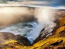 - **Gullfoss (Golden Falls)**: The waterfall roars like a thousand galloping horses, its torrents cascading down and creating mist that forms dazzling rainbows in the sunlight—both majestic and breathtakingly beautiful.