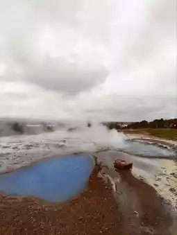 The surrounding geothermal field is otherworldly—pools shimmer with unreal blues and oranges, and the ground pulses with heat. There’s a strange silence between eruptions, broken only by the wind and the bubbling earth beneath your feet.
