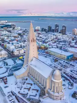 Hallgrímskirkja Church: Take the elevator to the top (extra fee) and enjoy a snowy view of colorful rooftops spreading like LEGO blocks to the black coastline.
