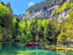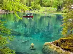 Though Blausee is relatively small, taking about an hour to walk around, photography enthusiasts might find even two hours insufficient to capture its beauty! Besides hiking around the lake, visitors can also take a ride on the iconic red boat. The lake's transparent waters make the boat appear as if it's floating in mid-air—an absolutely magical sight!