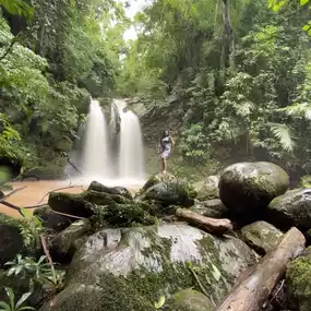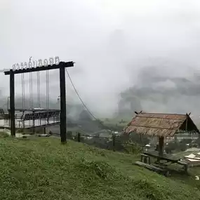 Start the trip by visiting Wat Phra That Khao Noi to receive blessings. The weather is great, and after receiving good energy, we head to the city district to enjoy local food in Nan. We stroll through the morning market and buy some coffee. Then, we continue our journey to the first homestay we booked, Rai Sud Mueng Po Bio Farm. This homestay offers a mountain view, surrounding us with nature. We had a comfortable sleep here on the first night. Waking up to fresh air and a delicious breakfast, we drive to our next destination, Sapan Village, known for its excellent ozone. There are many homestays here that you can book in advance on trip.com at reasonable prices. Most accommodations are wooden, and some offer packages that include dinner. You can choose according to your convenience. Along the way, we didn't miss taking photos with Highway 8 as a memento. By the afternoon, we arrived at Sapan Village. The atmosphere is peaceful, with mountain views all around, providing a sense of tranquility. We stopped for lunch while watching the flowing water. Afterward, we checked in at our accommodation, Doi Ing Dao at Dong Phaya. After a short rest, we went to visit Sapan Waterfall, which requires a walk of about 800 meters. The path is surrounded by nature, and we finally reached the waterfall with its strong flow. It was a wonderful time to be with nature and ourselves. On the morning of our return, we were greeted by a white mist, making it an unforgettable experience.