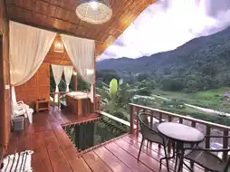The accommodation is built with wooden roofs and offers various types such as houses, tents, and riverside cottages. Every room allows you to enjoy the view and dine right in front of your room. Each unit is constructed along the hillside, ensuring that the views are not obstructed.