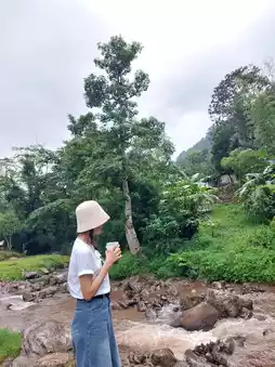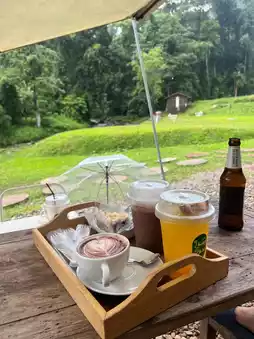 Long Khao Cafe 🏕️ is a camping-style cafe in Bo Kluea District, Nan Province. It is located in the middle of the forest, next to a stream. Inside, there is a spacious area with many tables to choose from, both along the stream and in the shady area. There are many drink menus such as coffee, tea and smoothies, as well as cakes and bakery. 🍰☕️
