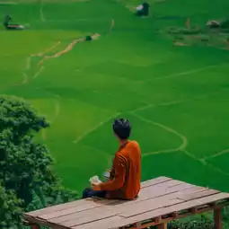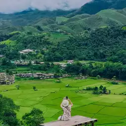 It is a cafe surrounded by mountains and has a green rice field below. During the rainy season, you can see the fresh green rice fields like this. It goes well with the green of the mountains and the fog. It feels like you are abroad.