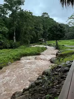 • An open-air wooden cafe designed in a riverside camp style. Seating options include tents, wooden chairs, and a relaxing streamside setting amidst lush greenery. 🌲