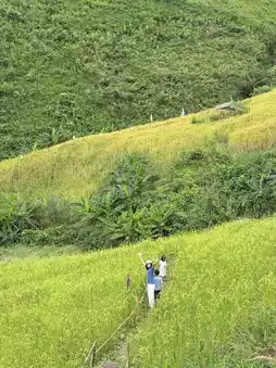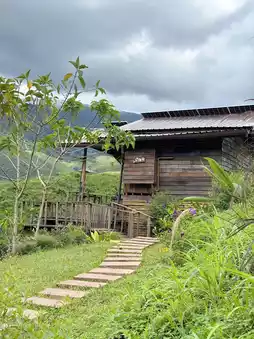 In front of the house, there are beautiful flowers planted. Between the stairs leading down to the accommodation, there's a waterfall flowing through bamboo tubes, creating a truly natural setting. The view is of the lush green mountains (during the rainy season) made from the green corn and rice plants. When we visited in October, the mountains were starting to turn yellow as the corn was starting to ripen.