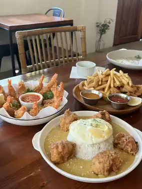 The mango salad, coconut shrimp, curry, French fries, and ragu pasta were all delicious, and the restaurant was a comfortable space with strong air conditioning, so