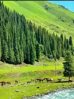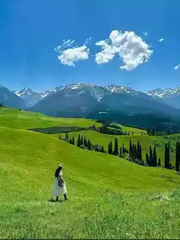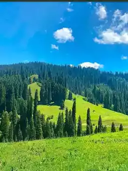 To see the primeval forest, you must visit Qapqal, where in May it's already fully green, with grasslands, forests, snow-capped mountains, complemented by blue skies and white clouds, picturesque.