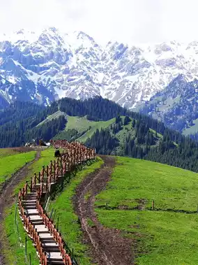 Nalati Grassland: Part of the Gongnaisi Grassland in Ili Kazakh Autonomous Prefecture, Xinjiang, it's one of the world's four great grasslands. Lush green grass and blooming flowers stretch endlessly, with snow-capped mountains in the distance and herds of cattle and sheep nearby, along with Kazakh yurts and horses, painting a beautiful pastoral scene.