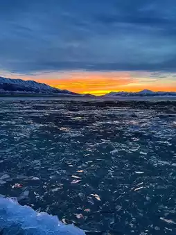 In winter, the lake freezes into a shimmering ice world surrounded by snowy peaks.