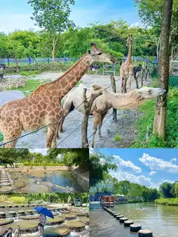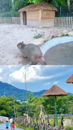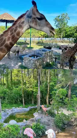 Camels, peacocks, giraffes, flamingos, ring-tailed lemurs, ostriches, black swans, parrots, bird flight performance area, capybaras, nutrias, red-crowned cranes, monkeys, kid goats