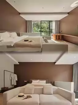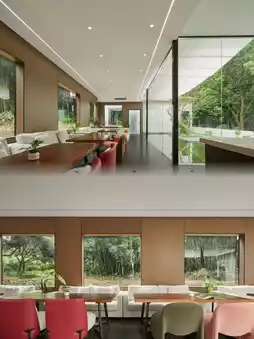 Each guest room is an independent artistic space. Hidden aromatherapy systems behind the headboards release pine fragrance. The bedding uses Hakka blue-dyed fabric, bath products are presented in Song dynasty-inspired celadon porcelain containers, and the minibar contains preserved plums and tangerine peels from Huizhou's time-honored brand "Zhimei Zhai." Most ingeniously, the smart system adjusts the room's lighting according to the time of day—simulating sunrise in the morning and automatically switching to a Nankunshan firefly mode at night.
