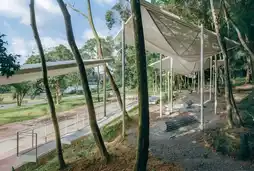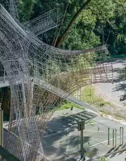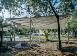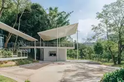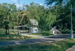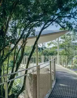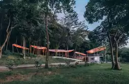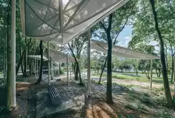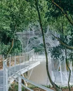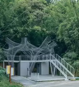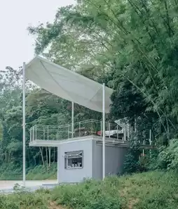 “Fengmei Post” is located in the dense forest beside Guoqian Village at Xiangang Reservoir, Luofu Mountain, Huizhou. Here, you can enjoy coffee, use the restroom, and wash and repair bicycles, fully meeting the needs of cycling enthusiasts by providing a dedicated space for rest and energy replenishment. The roof in the dense forest looks like a casually removed fluttering garment, with a light veil gently lifted by the breeze, flying and dancing among the green trees. The materials chosen are membrane fabric and fine steel wires, creating a soft and flexible form that invites people to let go of the heavy burdens of life and feel the tranquility and freedom brought by exercise and nature, welcoming visitors in a relaxed state.