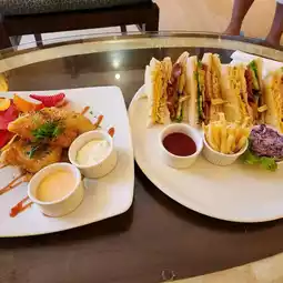 Fish and chips, club sandwiches, and Hawaiian pizza from room service~