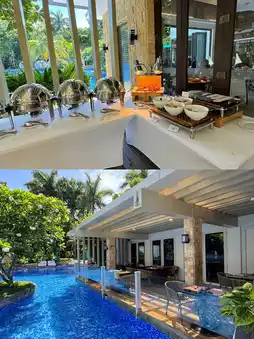 🍗 The hotel restaurant is right next to the swimming pool, where you can dine while enjoying the pool view. Afternoon tea starts at 15:00, focusing on a variety of desserts. The breakfast is very rich with a wide selection.