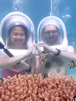 As the sun began its descent, we bravely ventured into the realm of helmet diving. Strapping on our specialised helmets, we felt like true explorers as we walked along the seabed, surrounded by the kaleidoscope of marine life that Boracay is known for. The shimmering waters and vibrant fish felt almost magical, allowing us to connect with the underwater world in a way we never imagined possible.