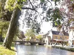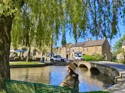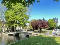 Bourton on the Water is a small village in the Cotswolds, located in the southwest of England. It is part of the Cotswolds Area of Outstanding Natural Beauty. The village features long and wide green spaces on both sides of its streets, with the Windrush River running through it, resembling a British countryside fairy tale with small bridges and flowing water.