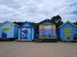 • Over 80 small wooden beach huts painted in vibrant colors with creative designs 🎨