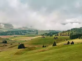 Rolling green meadows dotted with colorful wildflowers in summer.