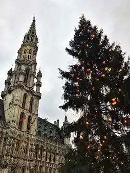 The main square in Brussels, known as the Grand Place, transforms into a winter wonderland during the Christmas season. As the holiday lights twinkle, the centerpiece is a magnificent Christmas tree that towers over the square, adorned with colorful ornaments and shimmering decorations. Surrounding the tree, the historic guildhalls and the Town Hall are illuminated, creating a magical backdrop that enchants visitors.