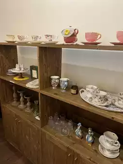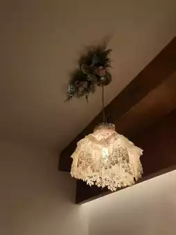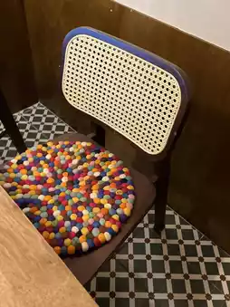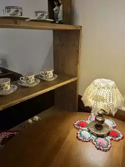 A cozy place with wood tones, vintage props, and an interior that feels like a spoonful of knitting has been dropped