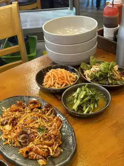 I had the stir-fried octopus as the main dish, and it was hearty and absolutely delicious. They also serve a wide variety of side dishes with vegetables!