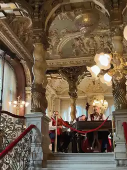 Opened in 1894, the New York Cafe boasts a splendid setting, often called "the most beautiful cafe in the world." Enjoying coffee and dessert beneath the golden décor and chandeliers will slowly ease the day's lingering emotions. There's no better place to end an elegant day in Budapest. 🍰🎹🌙