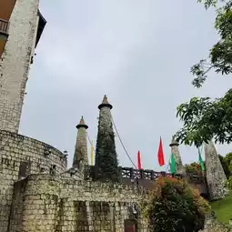 This picturesque wooden bridge surrounded by castle-like towers and draped in colourful flags instantly caught my eye. Walking across it felt like entering a medieval town — a rare vibe in Malaysia!
