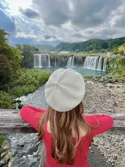 This waterfall in Oita Prefecture has been selected as one of the 100 best waterfalls in Japan. It is 120 meters wide and 20 meters high, and was created by the pyroclastic flow of the great eruption of Mount Aso 90,000 years ago. It is a spectacular spot where a waterfall suddenly appears in a tranquil rural area. It's like Niagara Falls in Japan. You can go down and get close to the waterfall, so you can enjoy the spectacular view up close while feeling the spray of the waterfall. There is a suspension bridge in front of the waterfall, so you can see the waterfall from the front. There is also a walking path from the top of the waterfall where you can look down at the waterfall basin, so enjoy the waterfall from various angles. Harajiri Falls