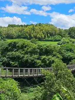 A swaying suspended deck bridge overlooking the Niagara of the Orient, "Harajiri Falls" from the front