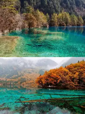 In autumn, Jiuzhaigou is adorned with red leaves and colorful forests, as if nature's palette has been overturned, with every corner whispering the essence of autumn (p7-8).